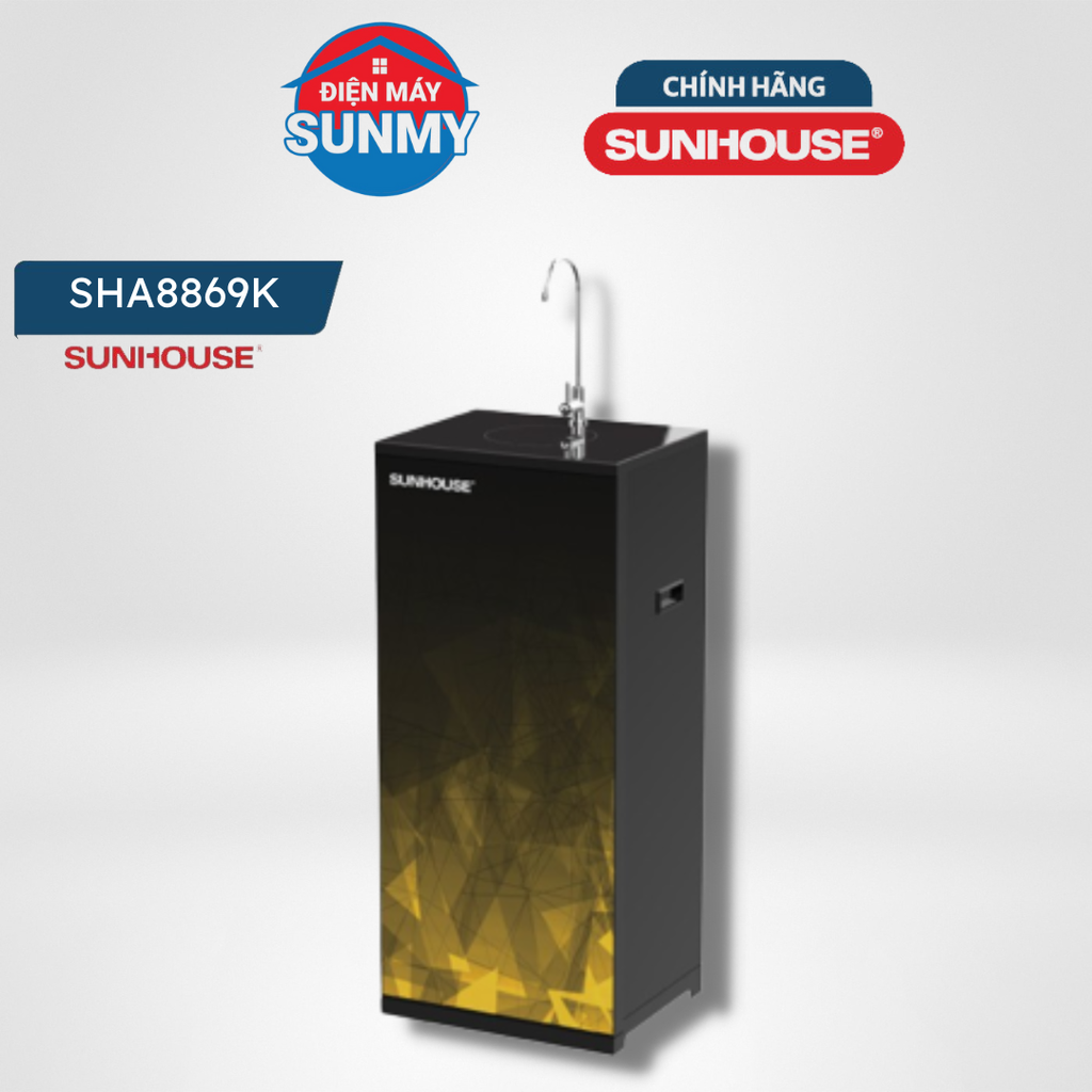 Máy lọc nước R.O 9 lõi SUNHOUSE SHA8869K có vỏ tủ làm bằng kính cường lực với họa tiết hiện đại, sang trọng trên 2 tông màu chủ đạo là đen - vàng. Thiết kế kính full viền mặt trên và mặt trước khiến sản phẩm trở nên đẹp mắt hơn. Đặc biệt, cánh tủ được thiết kế độc đáo với các thanh gia cố ở mặt trong, chắc chắn, hạn chế sa cánh tủ và móp méo khi sử dụng.